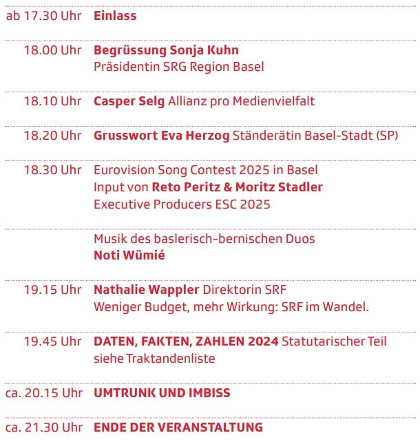 Für die 99. Generalversammlung lädt die SRG Region Basel am 29. April 2025 ins St. Jakob-Stadion ein. Mitglieder der SRG Region Basel erhalten eine persönliche Einladung.