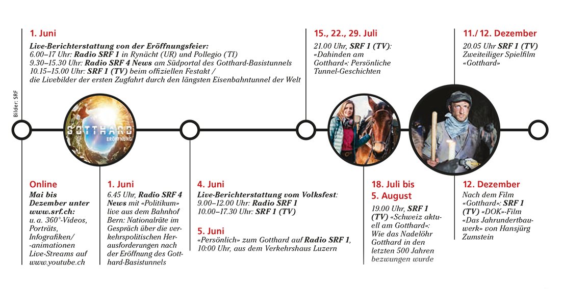 Das erste Highlight des bis Ende Jahr ausgestrahlten Sonderprogramms war die Direktübertragung der Eröffnungsfeierlichkeiten zum Gotthard-Basistunnel vom 1. Juni. Wie der Tunnelbau selbst, ist auch das Gotthardprogramm im Fernsehen, Radio und online vom Geist getragen, Sprach- und Kulturgrenzen zu überwinden.