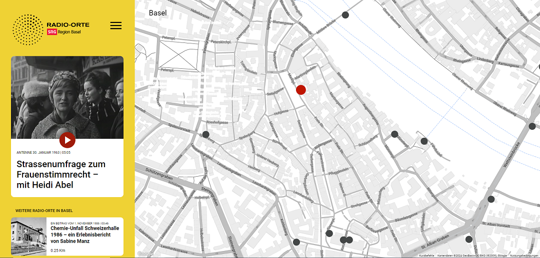 Das im Rahmen einer Ausschreibung der SRG Region Basel erkorene Konzept RADIO-ORTE von Carmen Bregy und Matthias Buschle nimmt uns mit auf eine Zeitreise durch die Basler Radiogeschichte: An rund 40 Orten in Basel und Liestal, über die DRS/SRF berichtet hat, können zukünftig Archivperlen des ehemaligen«Studio Basel» via Smartphone abgerufen und angehört werden. «Radio-Orte» dokumentiert so das journalistische Schaffen der letzten Jahrzehnte.